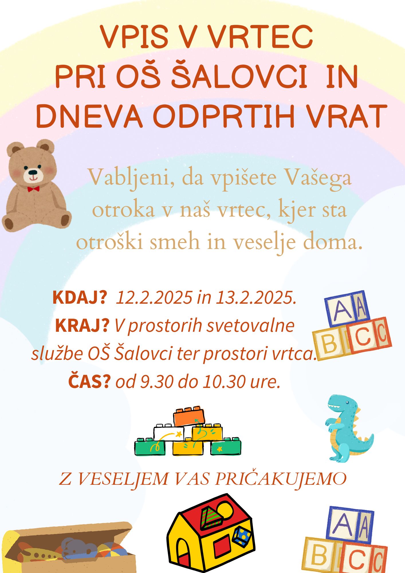 Vrtec pri OŠ Šalovci vpisuje in sprejema otroke v svoje programe na podlagi prijav vse leto glede na prosta mesta. Da pa bo naš začetek še lažji, pa Vas vabimo na redni vpis ter na dneva odprtih vrat. Več informacij glede vpisa dobite na tej povezavi: https://vrtecsalovci.splet.arnes.si/?page_id=763